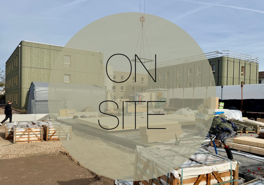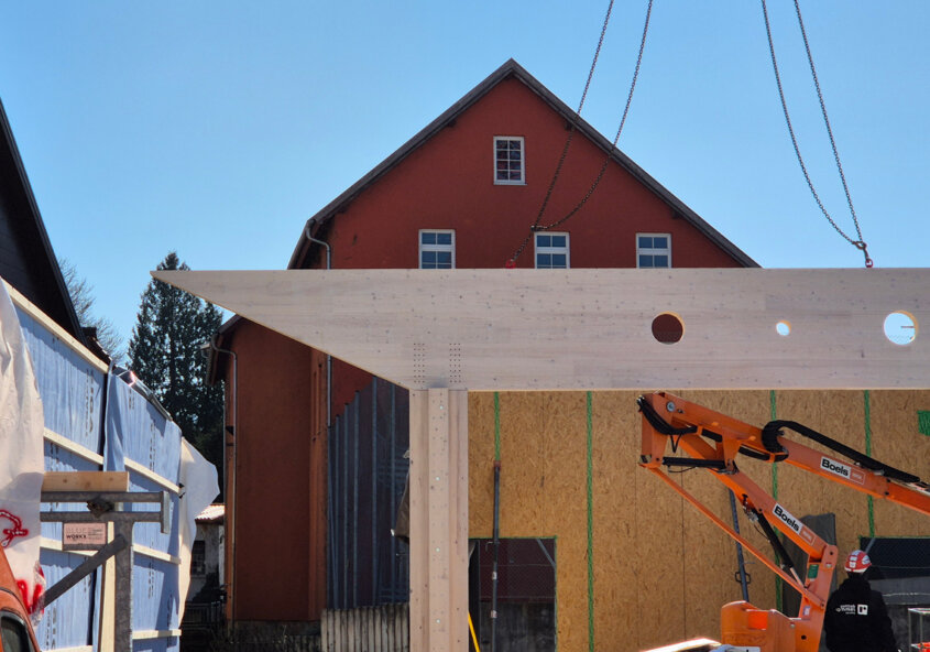 Diese Woche war der Start für den Holzbau. Die ersten von 30 BSH-Holzstützen und Außenwände wurden gestellt. Im ersten Bauabschnitt von insgesamt neun, werden 6 Stützen mit Innen-und Außenwänden errichtet. Im Anschluss wird der Bauabschnitt mit BSP-Deckenelementen abgeschlossen.